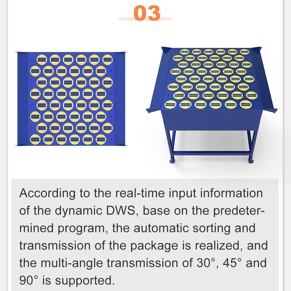 According to the real-time input information of the dynamic DWS, base on the predetermined program, the automatic sorting and transmission of the package is realized, and the multi-angle transmission of 30°, 45° and 90° is supported.