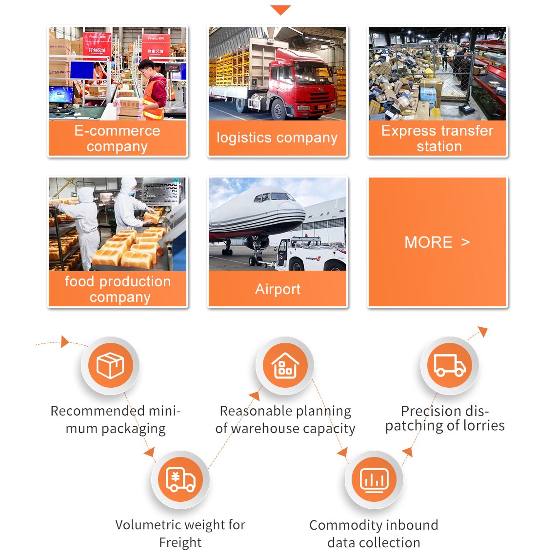 Smart warehousing & logistics solutions are suitable for intelligent management of goods in e-commerce, logistics, fresh food, food, airports and other industries. It is mainly composed of dynamic DWS, static DWS, inclined balance wheel sorter, conveyor belt and intelligent warehousing software system. It can collect parcel volume, weight and face sheet information and recommend the minimum package according to the collected information; complete the collection of product warehousing data; realize the reasonable planning of storage capacity; calculate the weight;volume and freight of the ;package to achieve the precise scheduling of trucks.