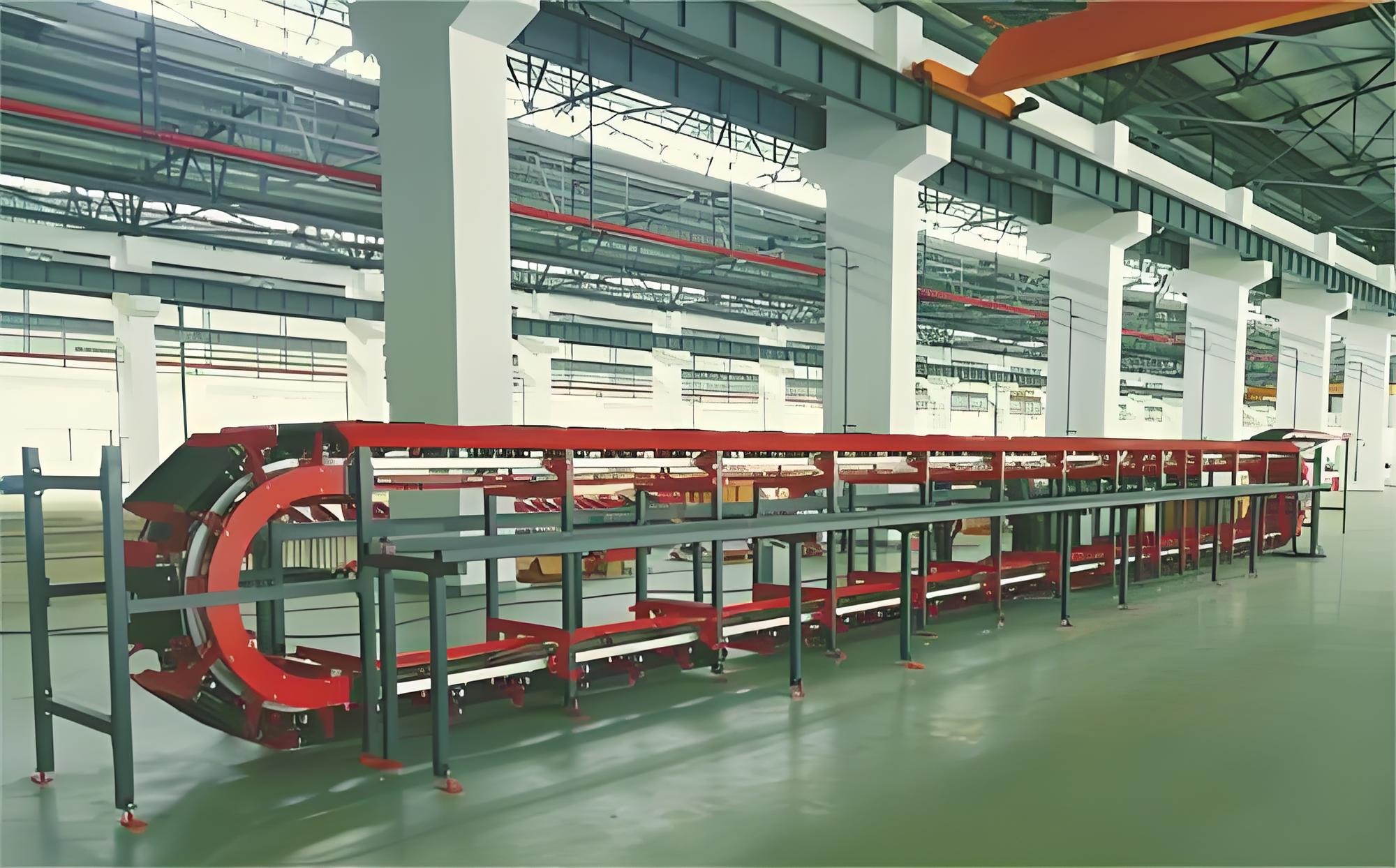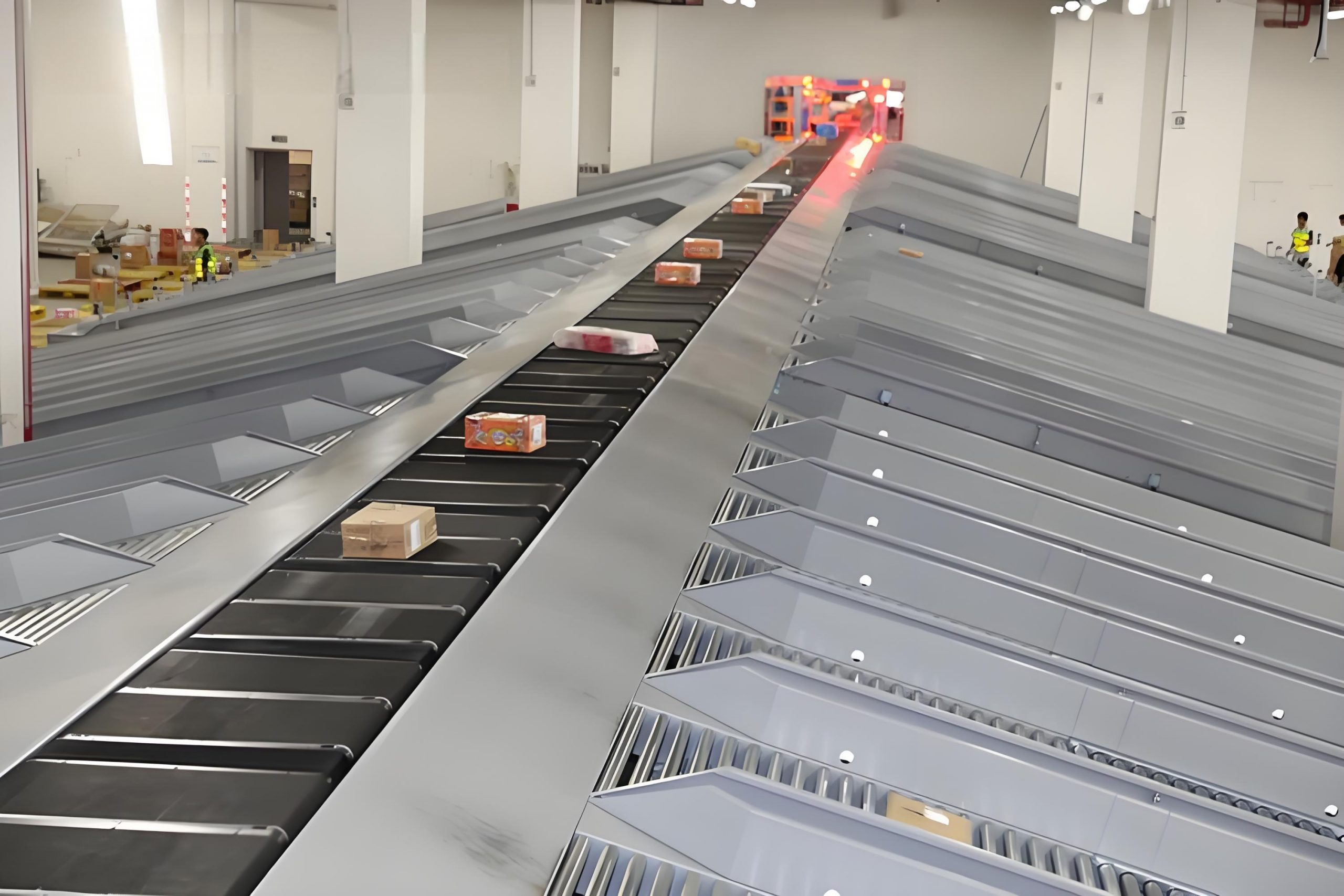 The parcels are placed on the parcel feeding table by manpower, when the parcels pass the upper scanning camera, the scanning system obtains the barcode information and uploads it to the server, the server feeds back the parcel information to calculate the drop-in information, and the parcels fall into the sorting cart, which runs through the track to the designated compartment, and then slides left and right by the belt of the cart, and sends the parcels to the designated position.